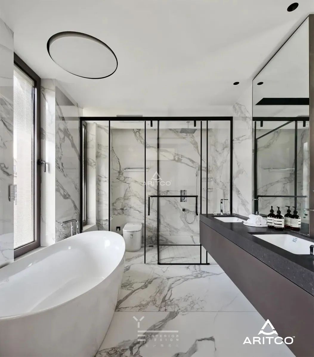 通過電梯來到別墅更高樓層,臥室延續(xù)了巖板材質(zhì)的運用,現(xiàn)代簡約的奢華感在通體大理石材質(zhì)的映襯下更加典雅,衛(wèi)生間鏡面的運用擴大了洗浴空間,使用起來更加便捷。